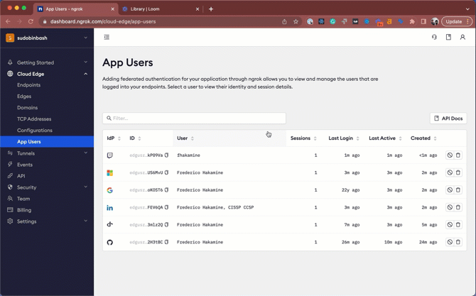 After that, return to the ngrok dashboard and access the app users page: (https://dashboard.ngrok.com/cloud-edge/app-users). You will see your session listed: