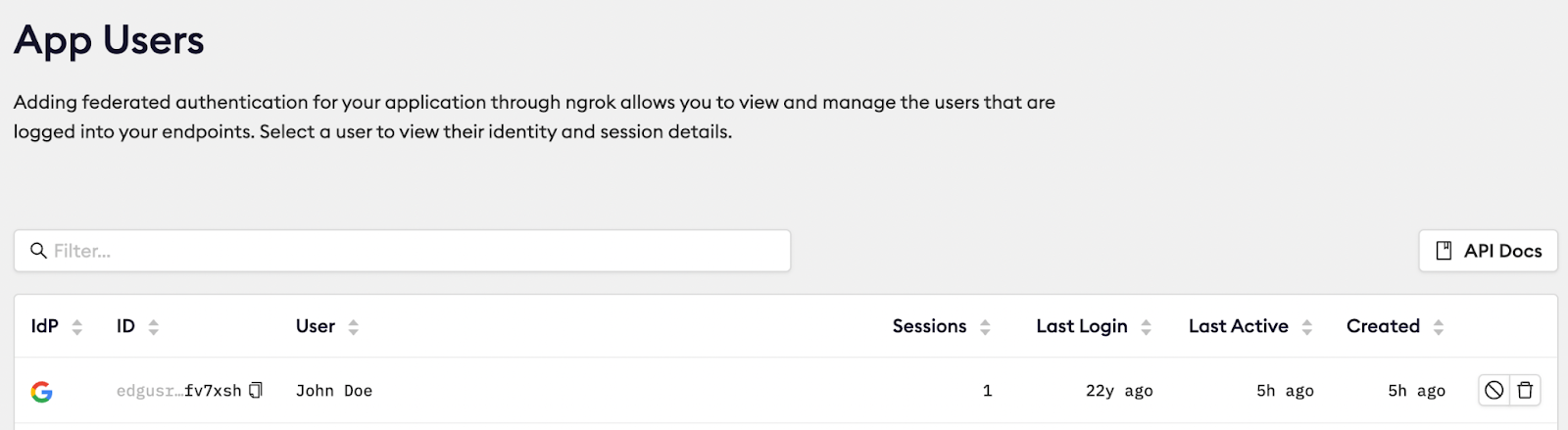 --header 'Authorization: Bearer {ngrok api token}'App Users allow ngrok admins and developers to get information about identities with sessions in ngrok tunnels — including user details and contextual info about device, identity provider, and network — and revoke sessions with instant results. And as we keep rolling out new features and integrations, this will become a key security component for any application.