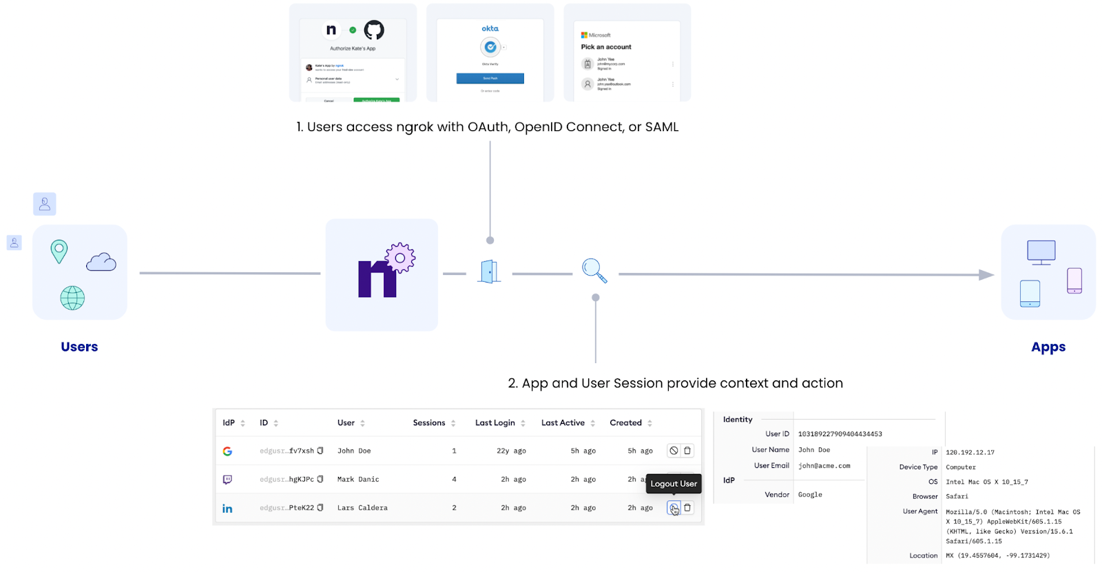 ngrok is the fastest way to add authentication to your applications. Today, we are adding additional visibility for users logging into your application through our edge. Now you can see your application users in the ngrok dashboard and view their identity details. This includes contextual information about their device, browser, and network along with the ability to revoke a session instantly.