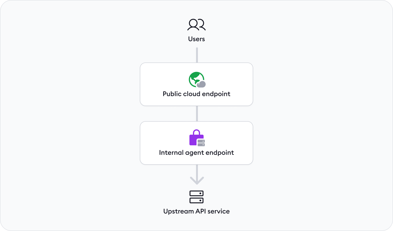 Unlike a public agent endpoint, which can accept traffic from the public internet, an internal agent endpoint runs on a URL like https://your-api.internal, which means it can only accept traffic from another endpoint owned by your ngrok account—in this case, your cloud endpoint.