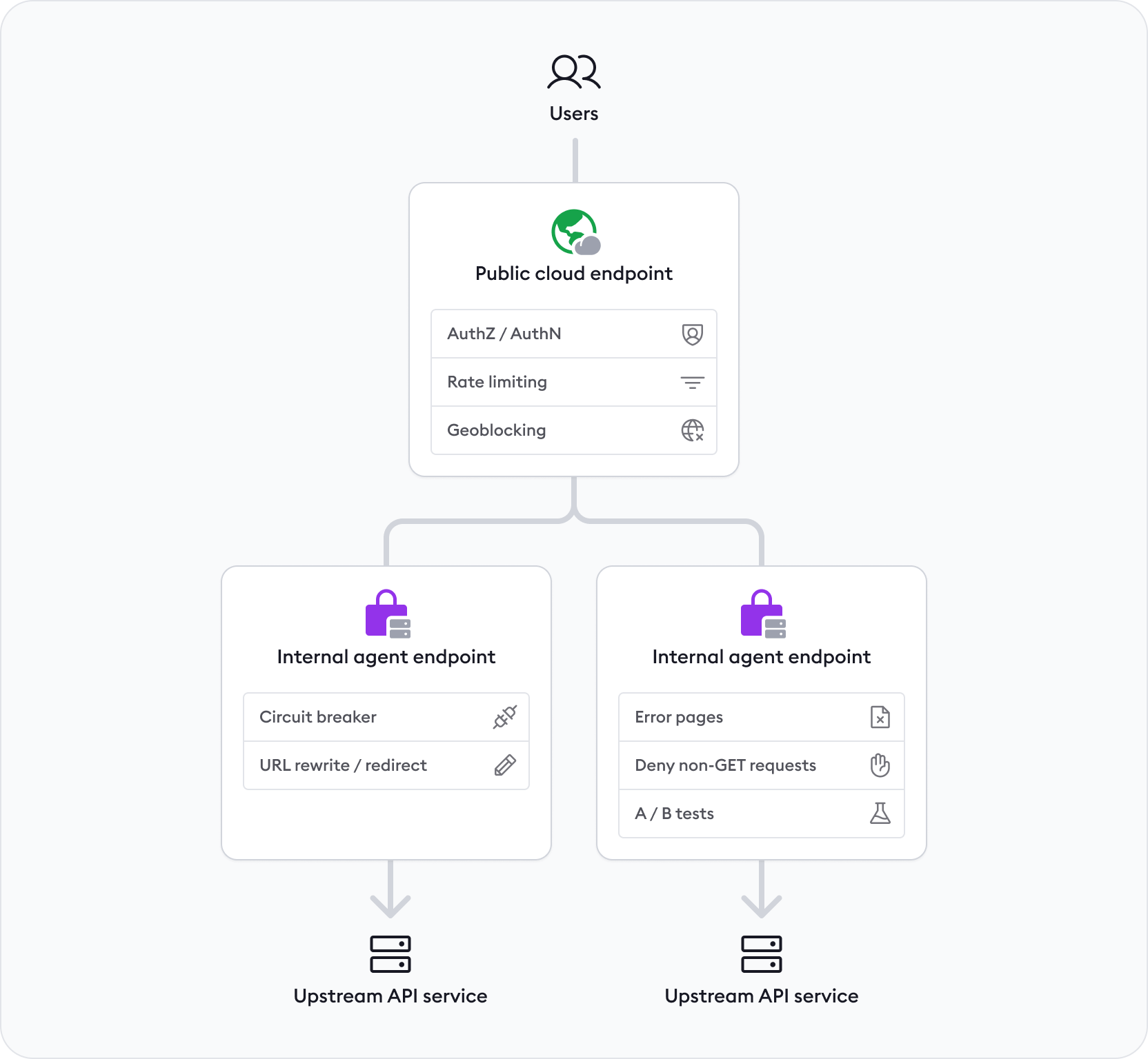 This composable shape works no matter how many upstream API services you have. Add an internal agent endpoint for each upstream service, plus a new forward-internal action based on how you want to route traffic between them.