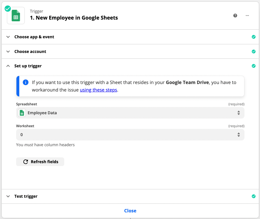 In the first action, follow Zapier instructions to connect your google account and select the Employee Data sheet.