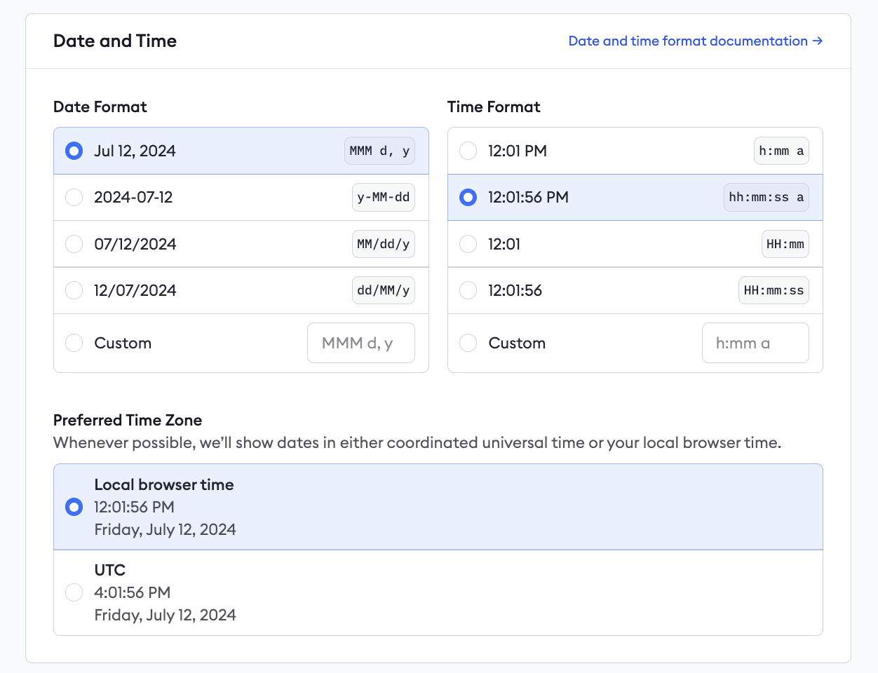 You can access it from the User Settings page in the drop down menu next to your account name. You can choose between your local timezone or UTC to help align with other tools in your stack. You can also choose the date and time format depending on where you are located (month-day-year vs day-month-year for example). If none of our preconfigured options work for you, feel free to define your own.