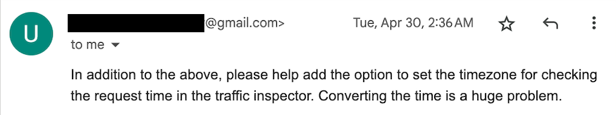 One of the great things about being at a developer focused service like ngrok is being able to get great feedback from the community about new and upcoming products. As we were building our new Traffic Inspector, we heard from users that they needed a way to customize the timestamps of their requests to make it easier to align with other tools.