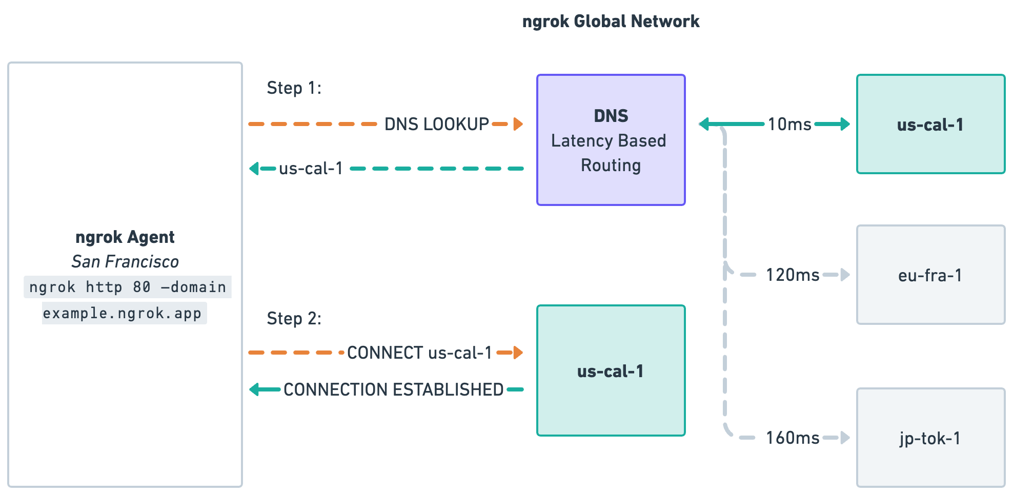 ngrok agents with no region specified on startup will automatically create a connection to the region with the lowest latency. This ensures requests made against that specific agent have the shortest connection time possible. In the example above, the agent deployed in San Francisco first connects to a DNS server. The DNS Server returns the IP address of the PoP with the lowest latency which in this case is us-cal-1. Connection is then established between the agent and this PoP.