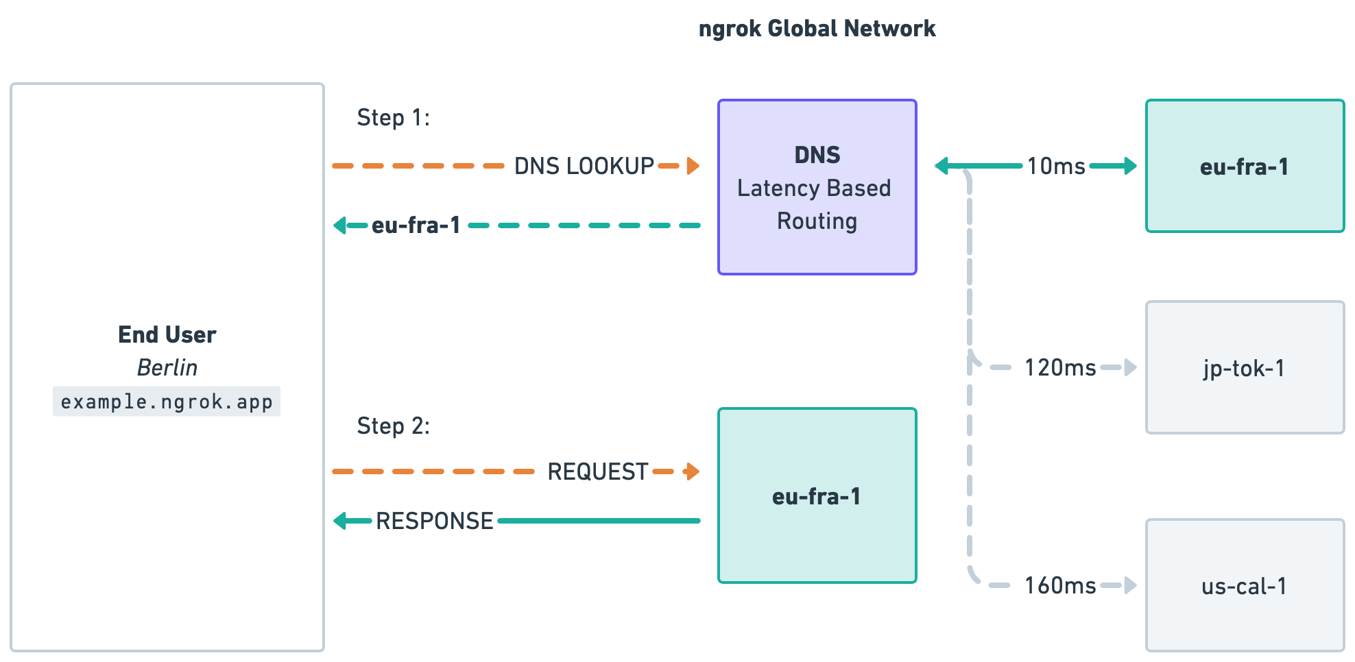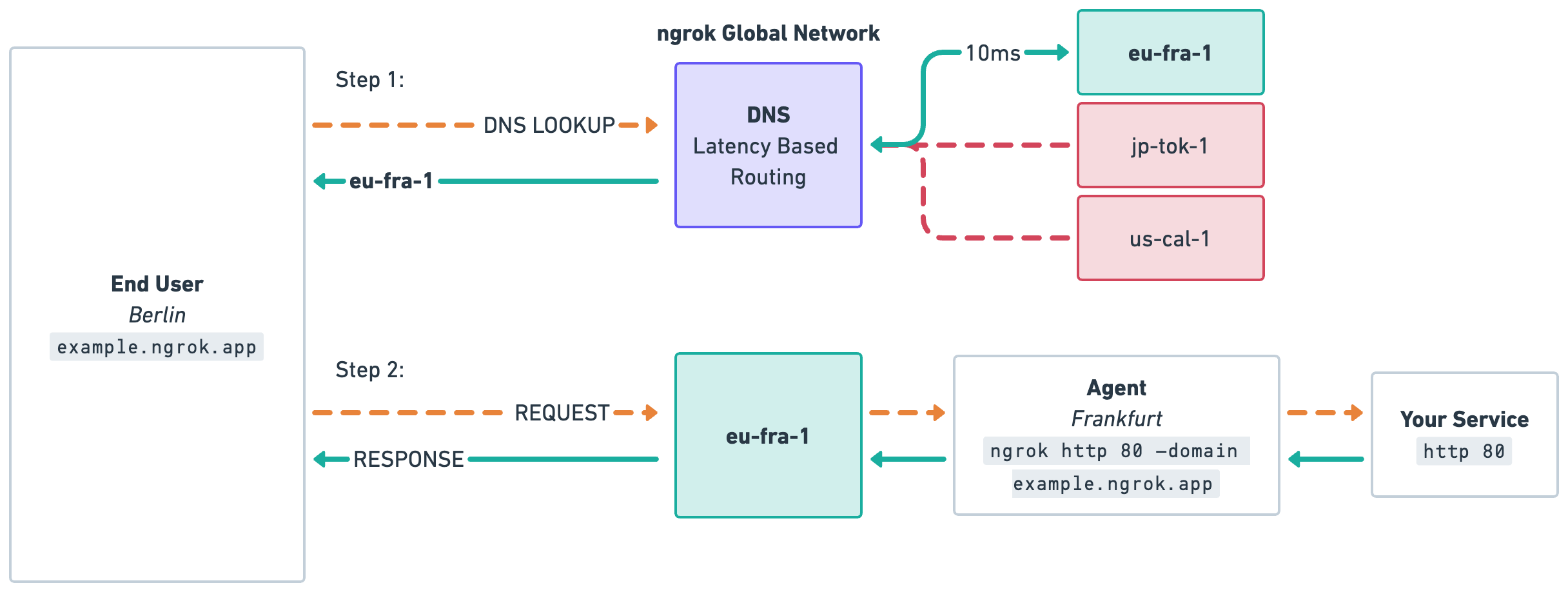 End user out of Berlin connects to example.ngrok.app through ngrok’s eu-fra-1 PoP which has the lowest latency of 10ms