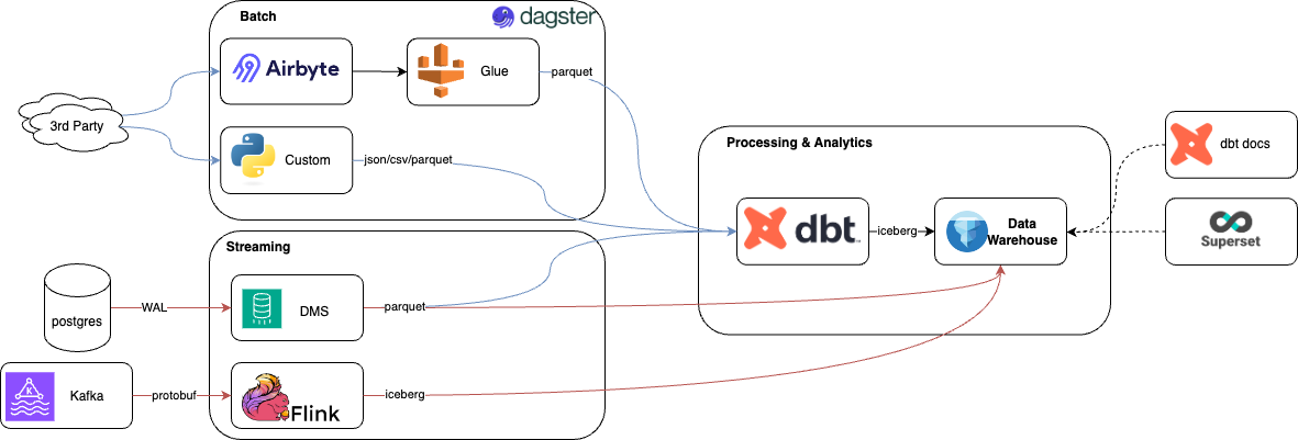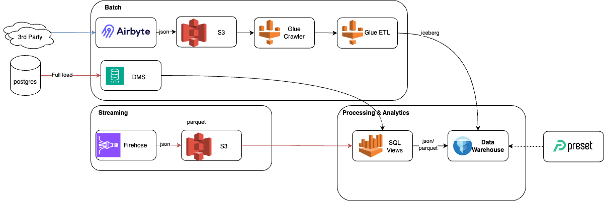 For analytics, all our data was (and still is) eventually stored as Apache Iceberg and generally queried via AWS Athena, although the legacy architecture did have some datasets that were based on raw JSON in the mix. We used AWS Glue as a meta store.