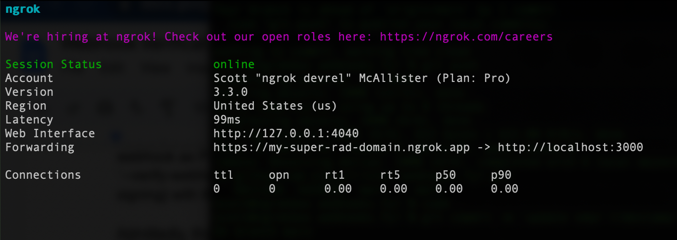 And, to run the ngrok command you need to know the webhook secret to set the value for --verify-webhook-secret so you’ll need a paid ngrok account.