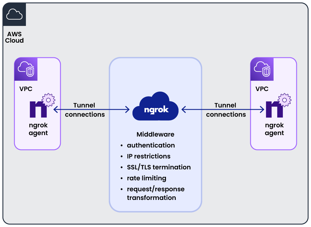 ngrok takes a different approach in AWS environments, relying on just a few primitives. A standalone agent runs inside your VPCs and creates outbound tunnels to provide ingress and egress to nternal services. Finally, those tunnels connect to the secure ngrok network, which configures and modulates all the complex networking infrastructure for you.