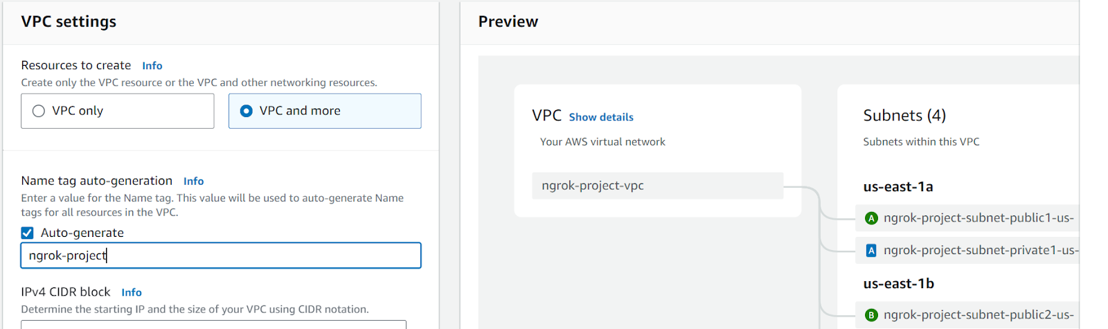 Select VPC and more, then Auto-generate.