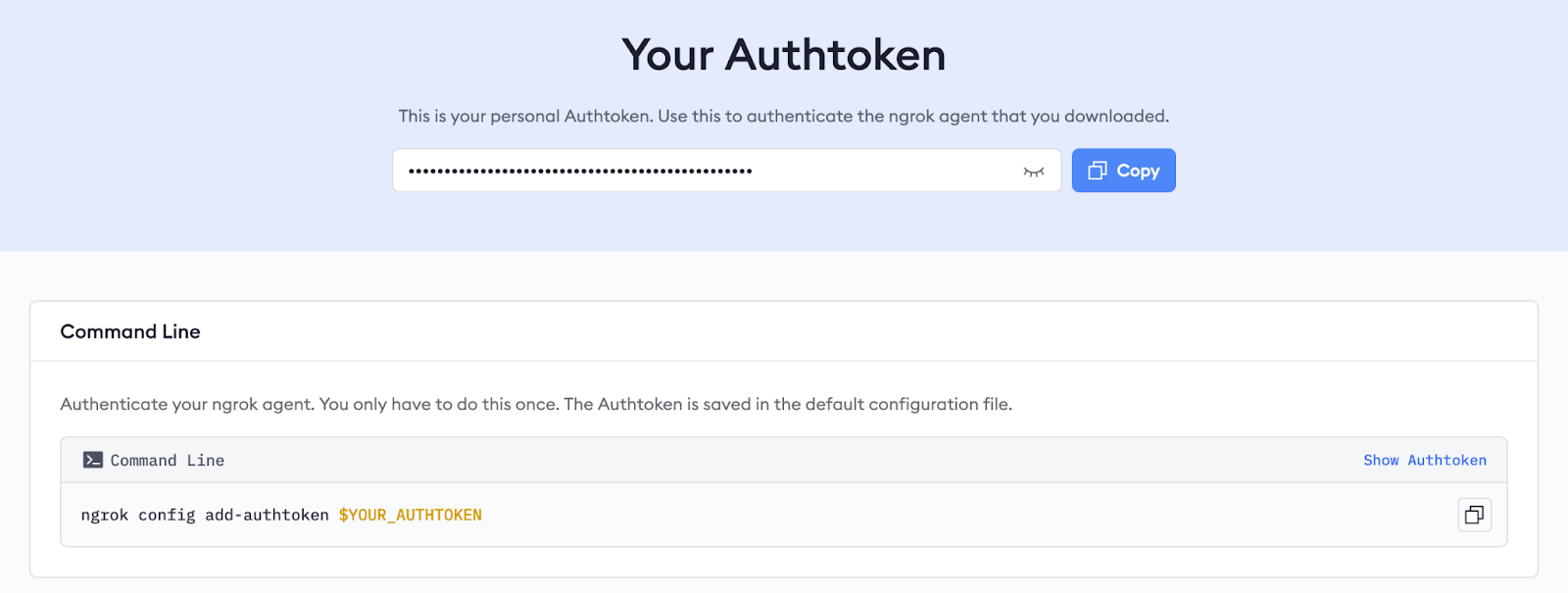 Click the Copy button and run the following command to add your authtoken to the agent’s persistent configuration: