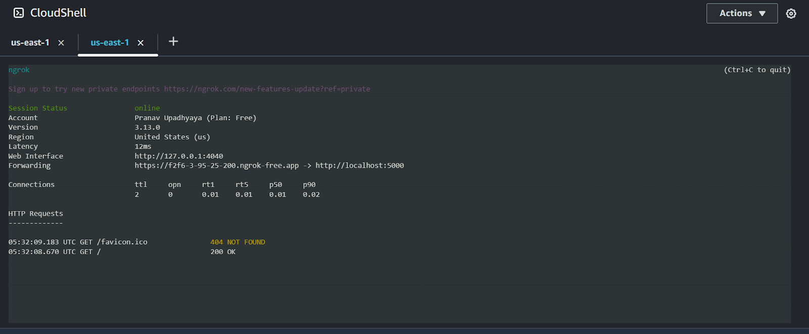 Create another window for AWS CloudShell and instruct the ngrok agent to ingress traffic to port 5000.
