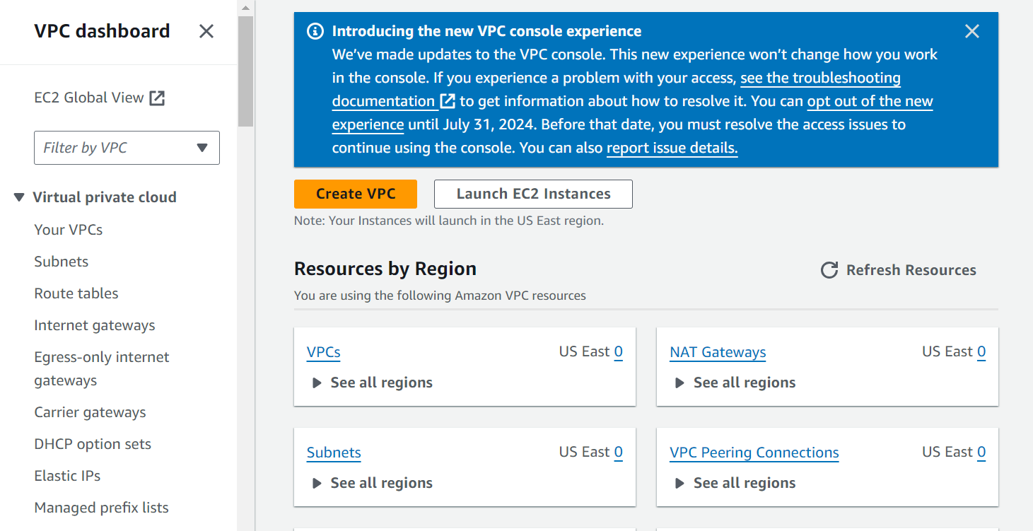 Before provisioning your EC2 instance, create a VPC in your VPC Console.