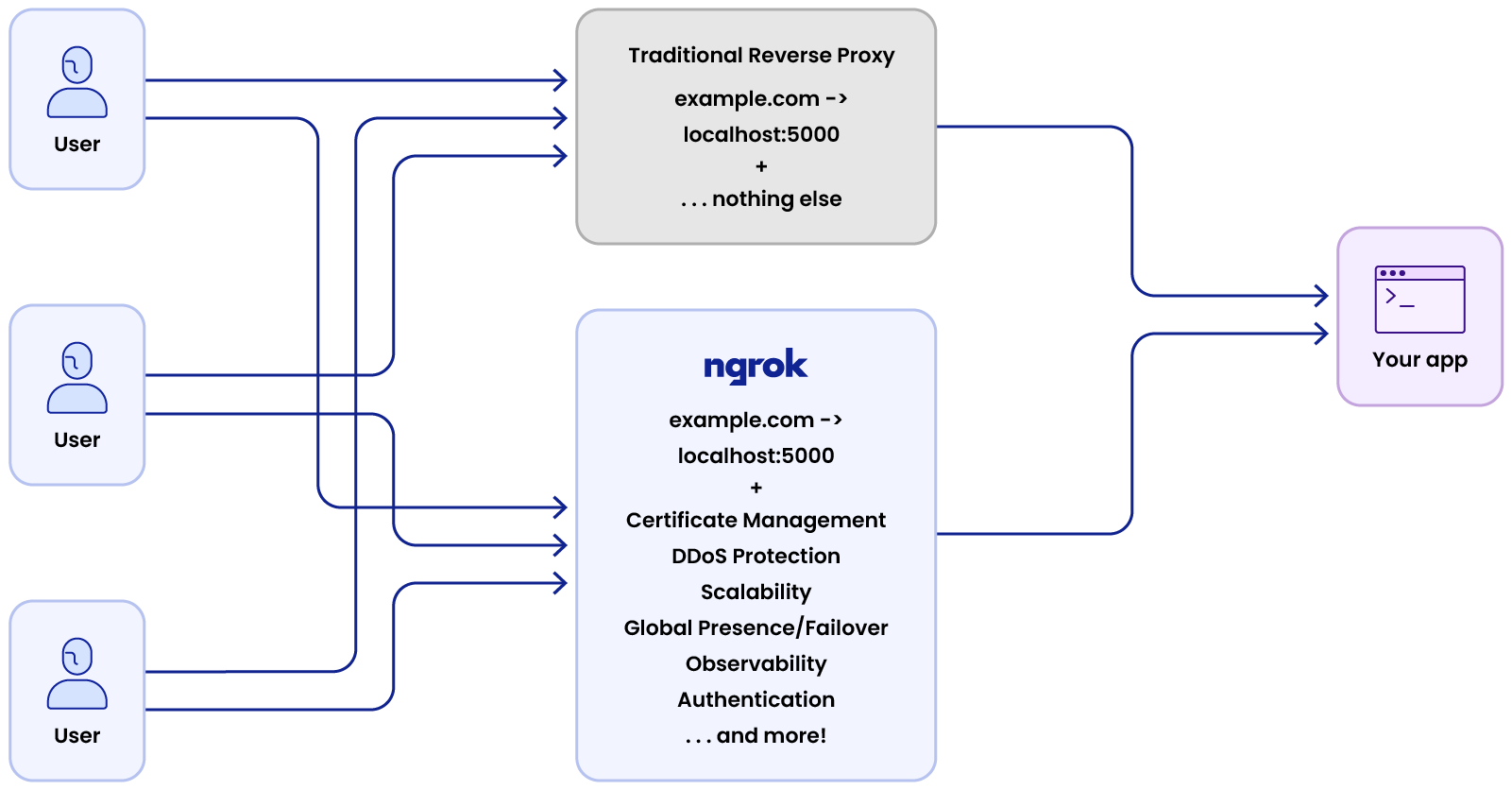 ngrok http 5000 --domain {YOUR-CUSTOM-DOMAIN}Whether you’re testing a new app in development, want to share your progress on localhost with a colleague on another continent, or are prepping for production, ngrok instantly simplifies how you set up a reverse proxy on AWS.