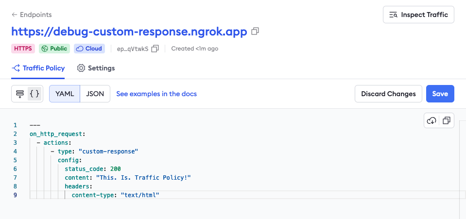 This Traffic Policy action returns a hardcoded response back to the client that made a request to your endpoint.
