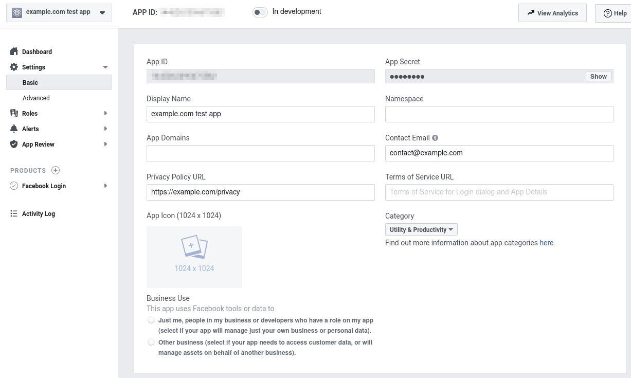 - At the top, save your App ID and App Secret for later.