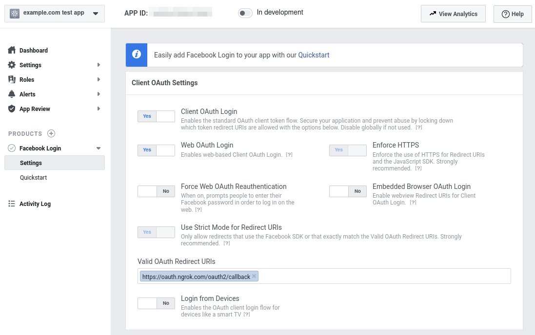https://idp.ngrok.com/oauth2/callback - Save the Facebook Login settings page. Final configuration should match: