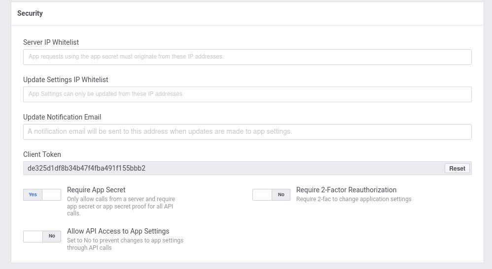 - Enable “Require App Secret”. See documentation for how to call Facebook Graph API with this feature.