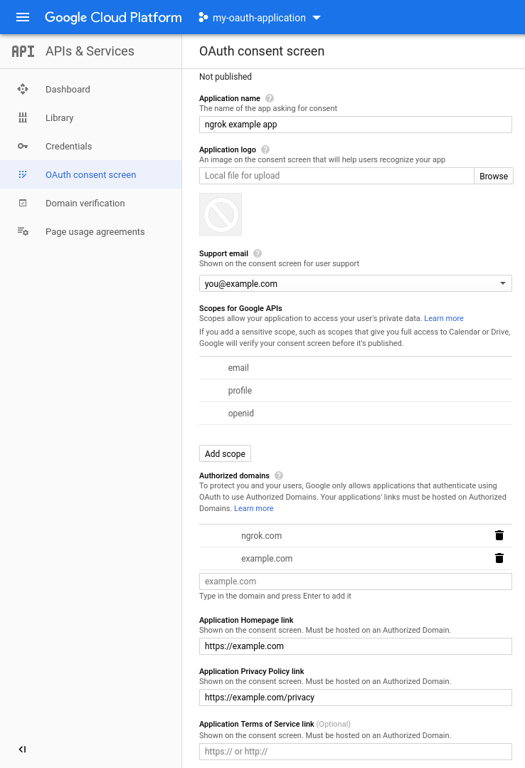 ngrok.comand your application homepage domain. - Add links to your application homepage and privacy policy. The final consent screen should resemble: