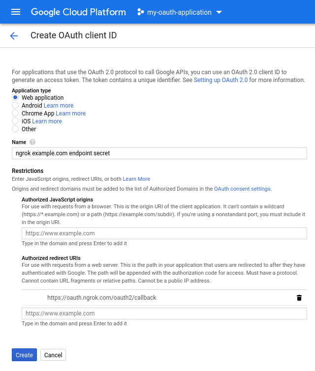 Setting up your own Google OAuth application will allow you to customize how authentication works with fine-grained detail. This guide walks you through setting up a Google OAuth 2.0 application to use with your ngrok endpoints.