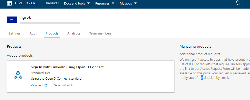 Click the Products tab, and then click Request access for Sign In with LinkedIn using OpenID Connect.