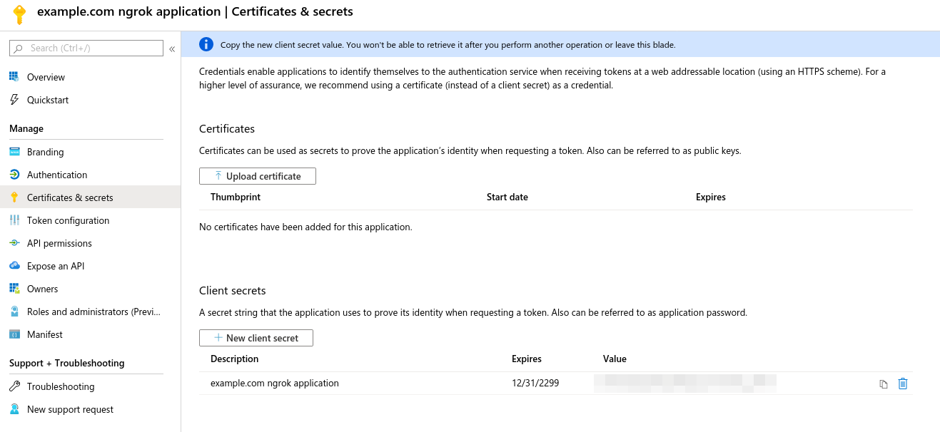 - Select “New Client Secret” at the bottom, name the secret, set an expiration, and hit create.