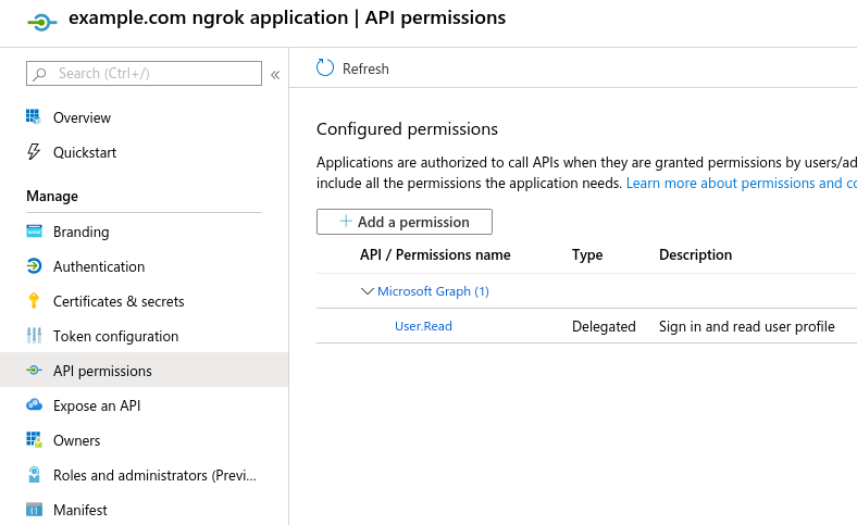 User.Reador a more permissive scope (for example,User.Read.All) is configured for ngrok. Example minimal configuration: