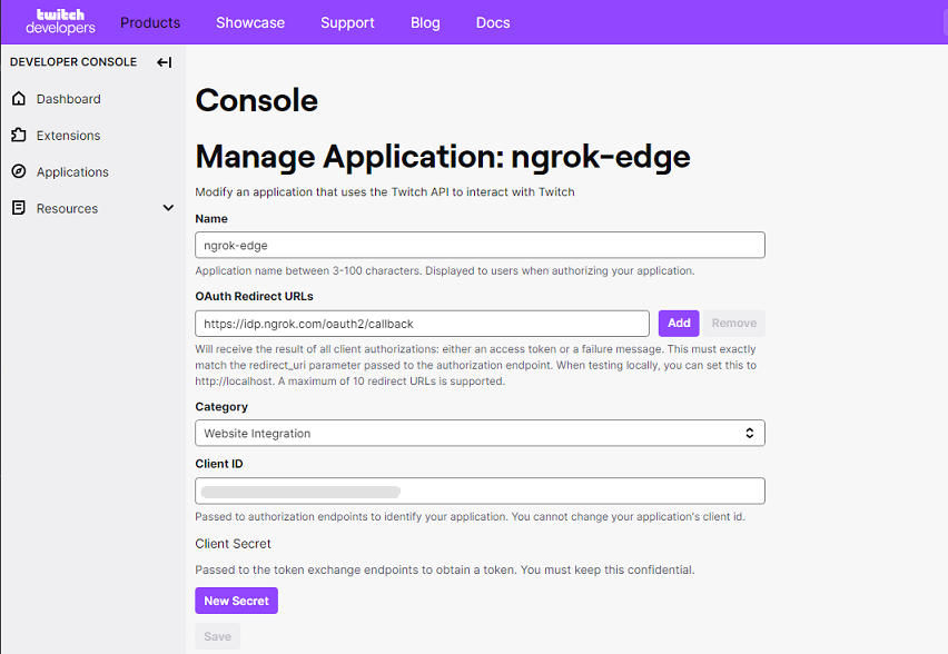 https://idp.ngrok.com/oauth2/callbackin the OAuth Redirect URLs field, select Website Integration in the Category selector, and then click Create. Note: Make sure you have two-factor authentication enabled for your Twitch account. - On the Developer Applications page, click Manage for your application.